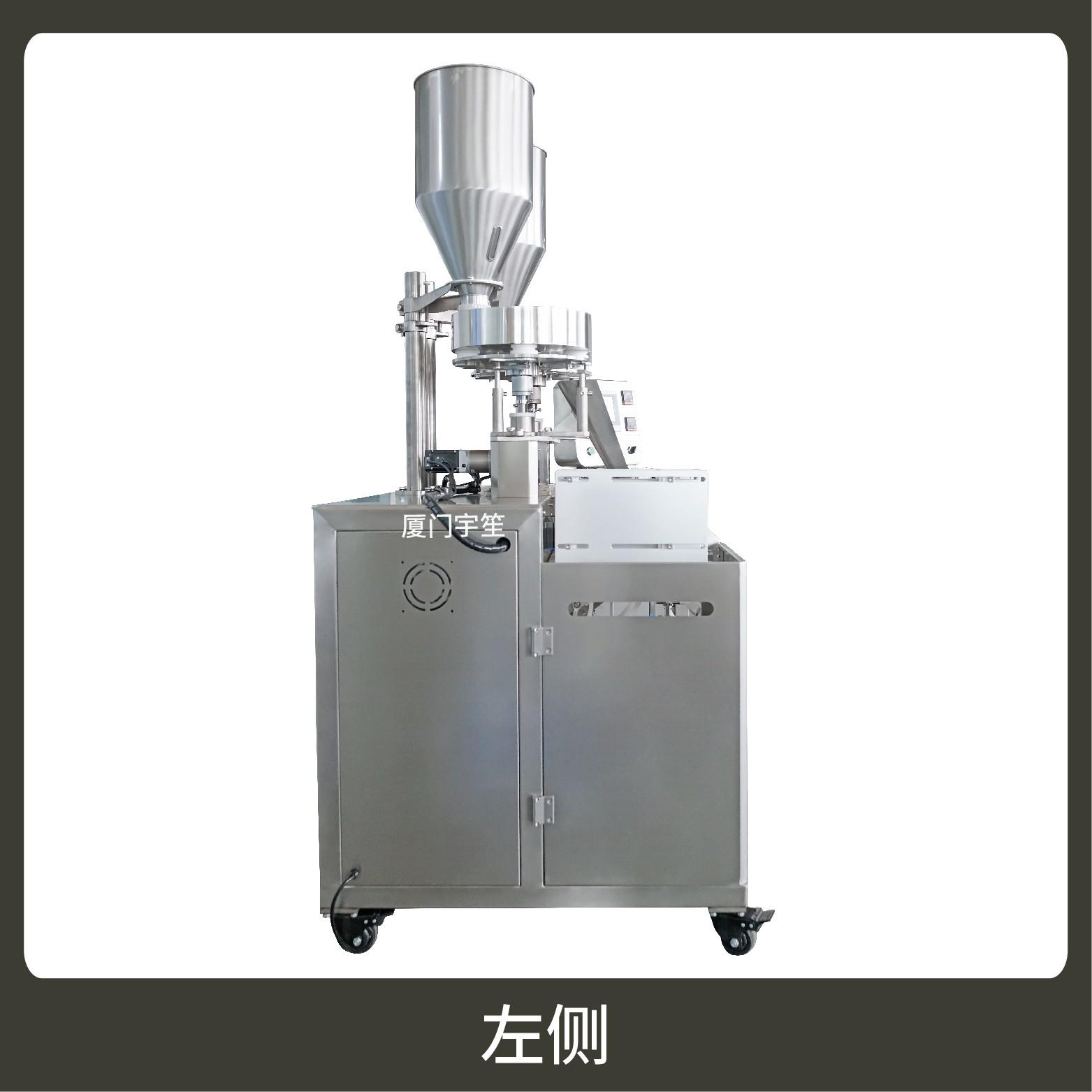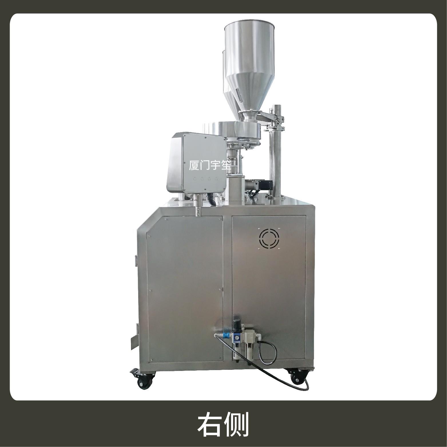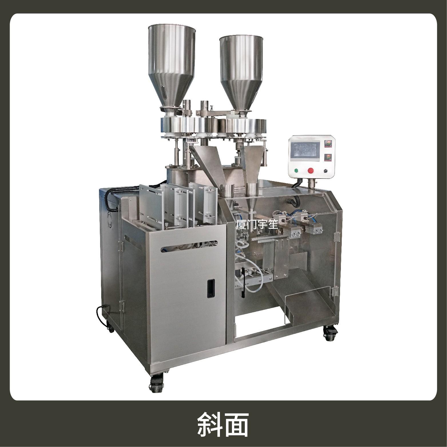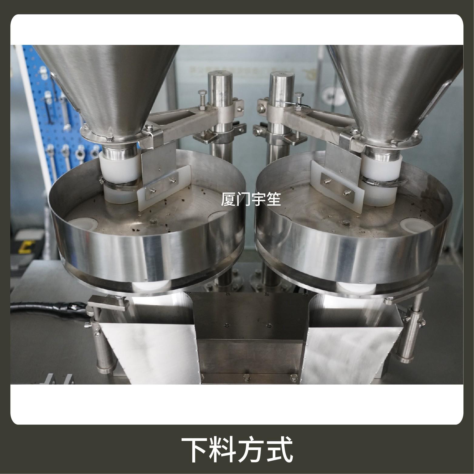 1、成品雙出,速度快,包裝流程全自動,無需人工操作??筛鶕?jù)充填物料的性質(zhì)選配不同的下料結構。
