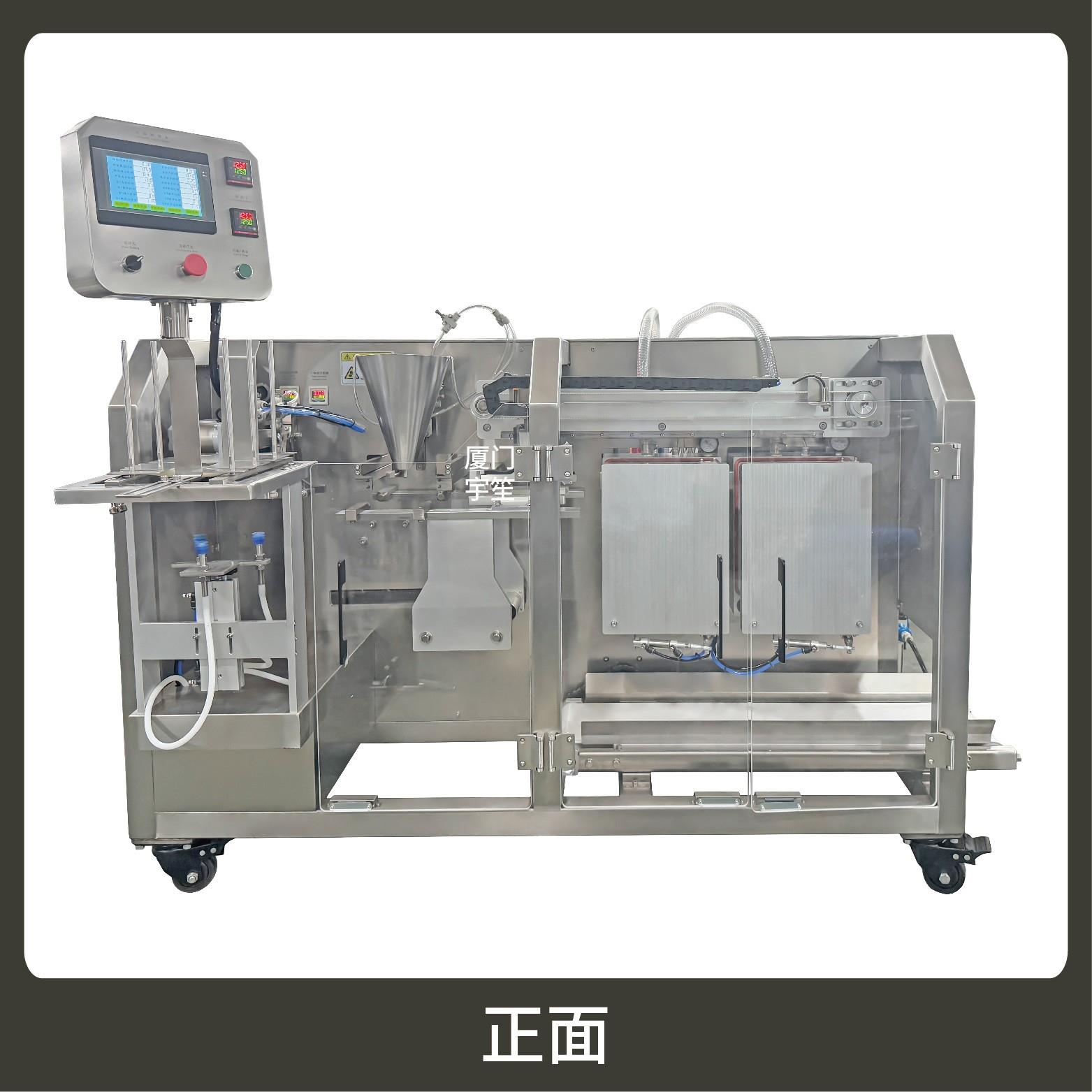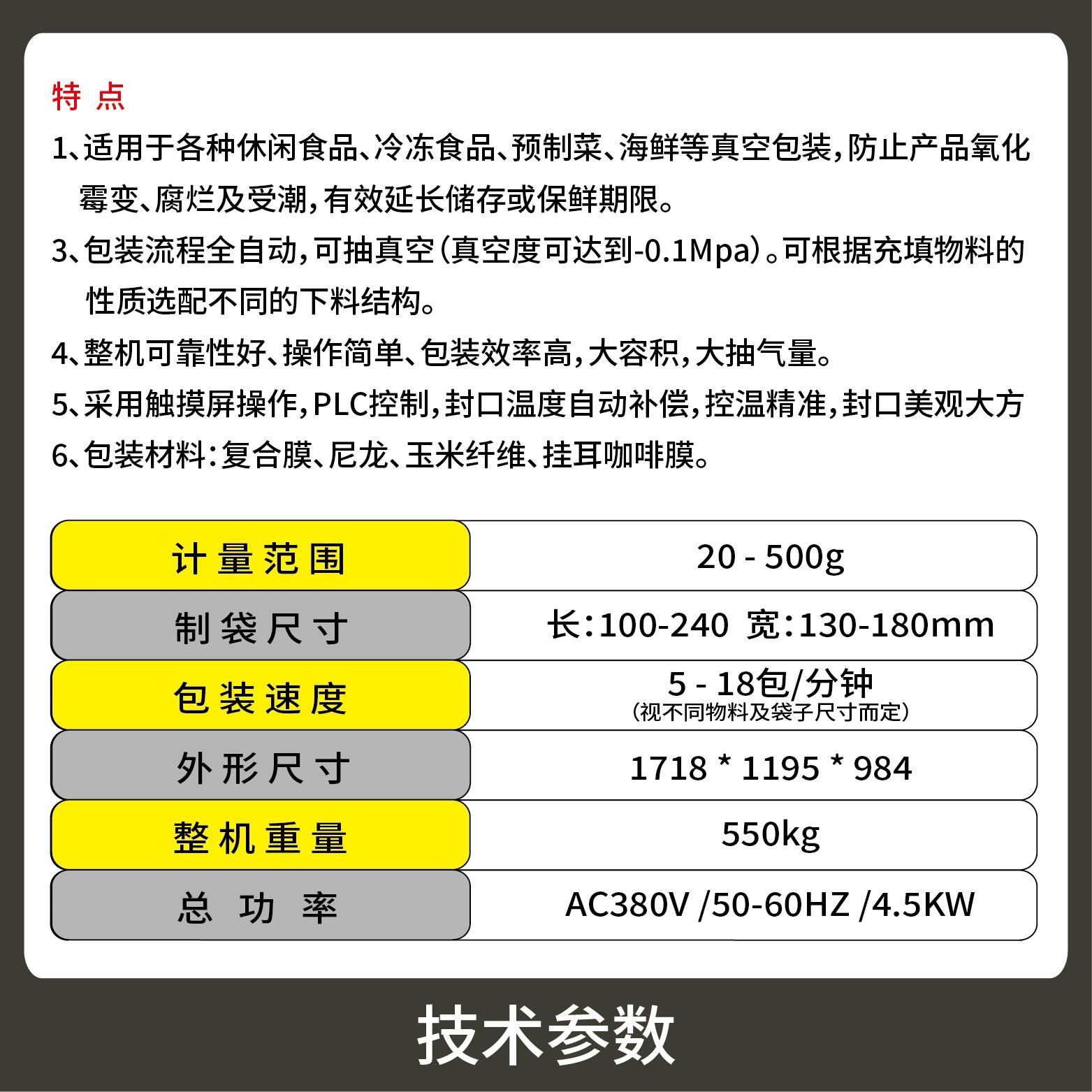 2、包裝流程全自動,可抽真空(真空度可達到-0.1Mpa)。可根據(jù)充填物料的性質(zhì)選配不同的下料結(jié)構(gòu)。