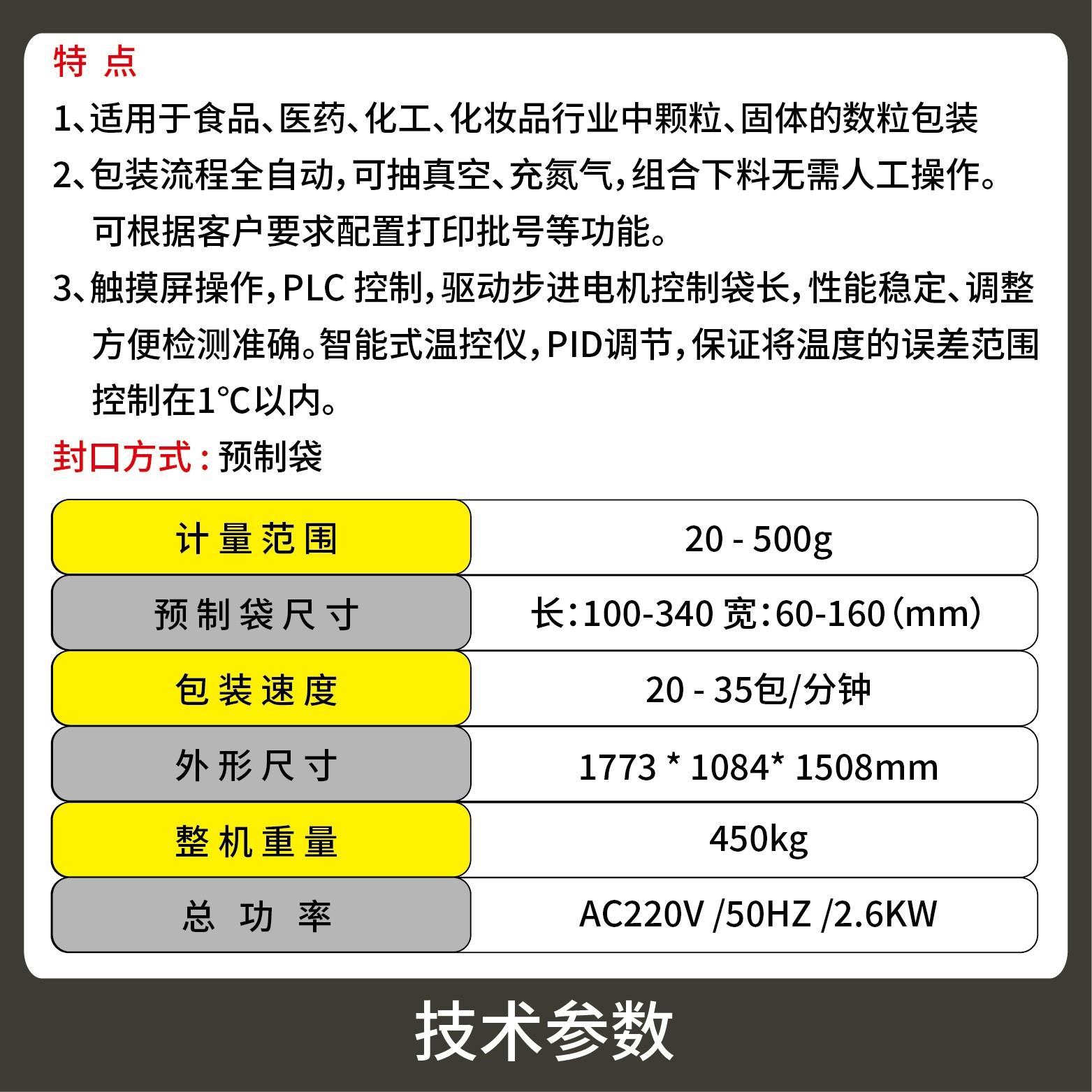 1、適用于食品、醫(yī)藥、化工、化妝品行業(yè)中顆粒、粉劑、液體、醬料等物品的計量包裝。